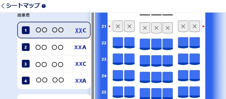 ※×はすでに予約済みの席のため、青い席を選択します。