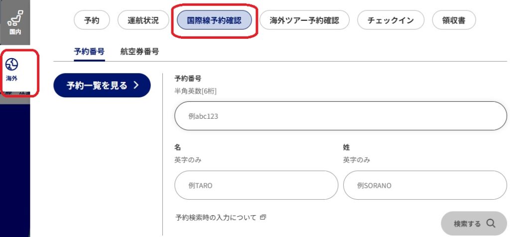 羽田→宮古は国内ですが、海外も含めて予約を取っているので「国際線予約確認」から検索してくださいね!