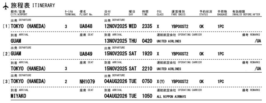 | 東京(羽田) | グアム | UA848 | 2025/11/12(水)23:35 | 2025/11/13(木)04:20 |