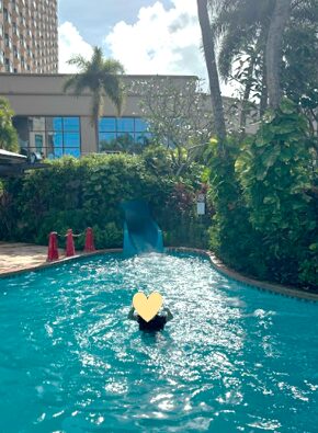 洗濯を回してからプールへ向かうと、なんと一番乗り!まだ清掃中でスタッフが網でゴミを取っていましたが、スライダーやプールはすでに利用可能。