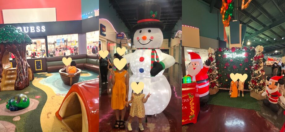 すでにアウトレットの中はクリスマス仕様の飾りつけ。夏のような暑さで半袖なのに、クリスマスツリーがあるなんてびっくりですよね?!