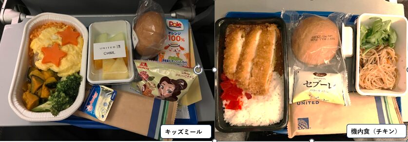 機内食は0:43頃キッズミールが先に届き、1:00頃大人のご飯タイム。