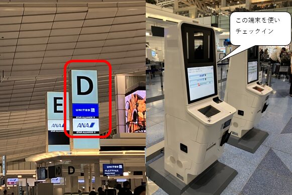羽田空港第3ターミナル到着後、ユナイテッド航空のDカウンターで機械チェックイン。