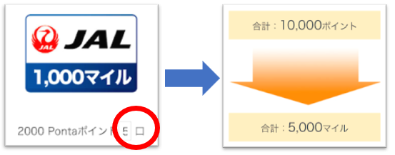 例:2,000Pontaポイントを5口→10,000Pontaポイント交換(5,000JALマイル