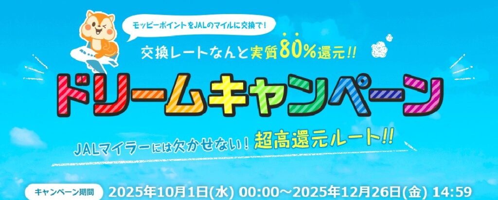 ポイントサイト「モッピー」のドリームキャンペーンを使えば、JALマイルが実質80%の高還元率で交換可能に。